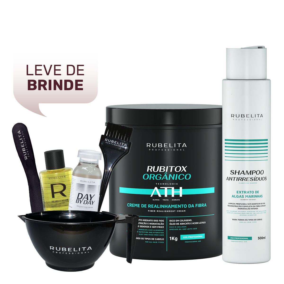 O Rubitox Orgânico da Rubelita Professional conta com a Tecnologia ATH, junto com Óleo de Abacate, Ácido Lático e Colágeno, que revitaliza os cabelos, além de deixá-los nutridos e saudáveis.
